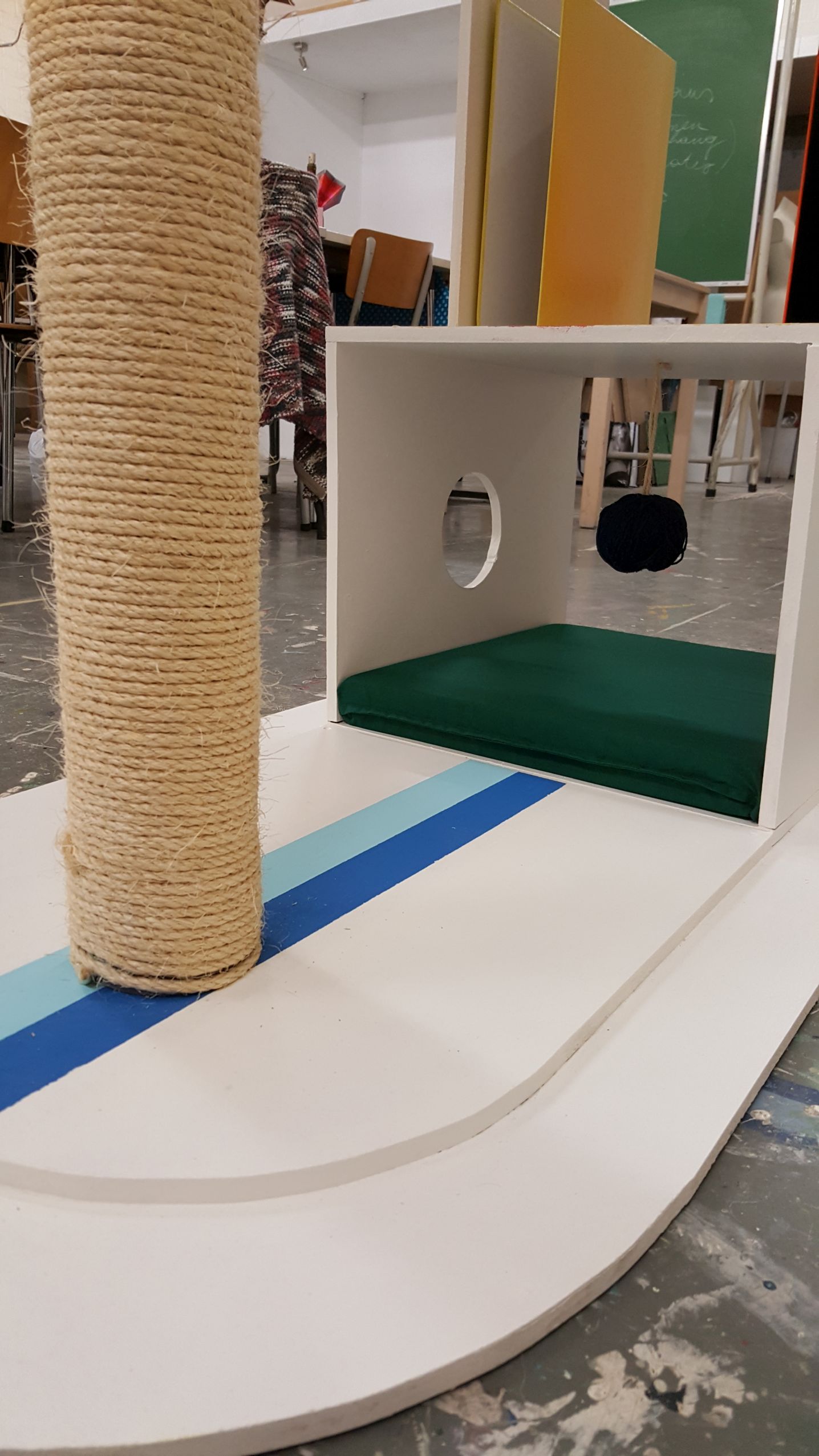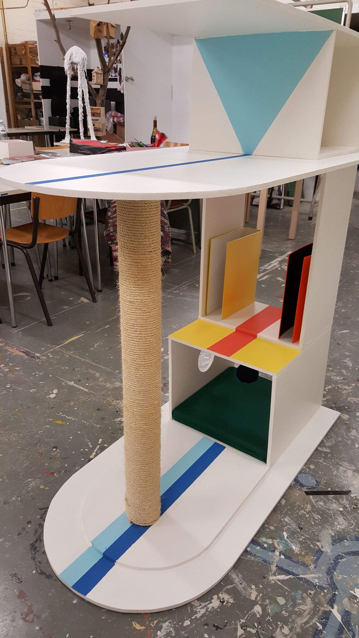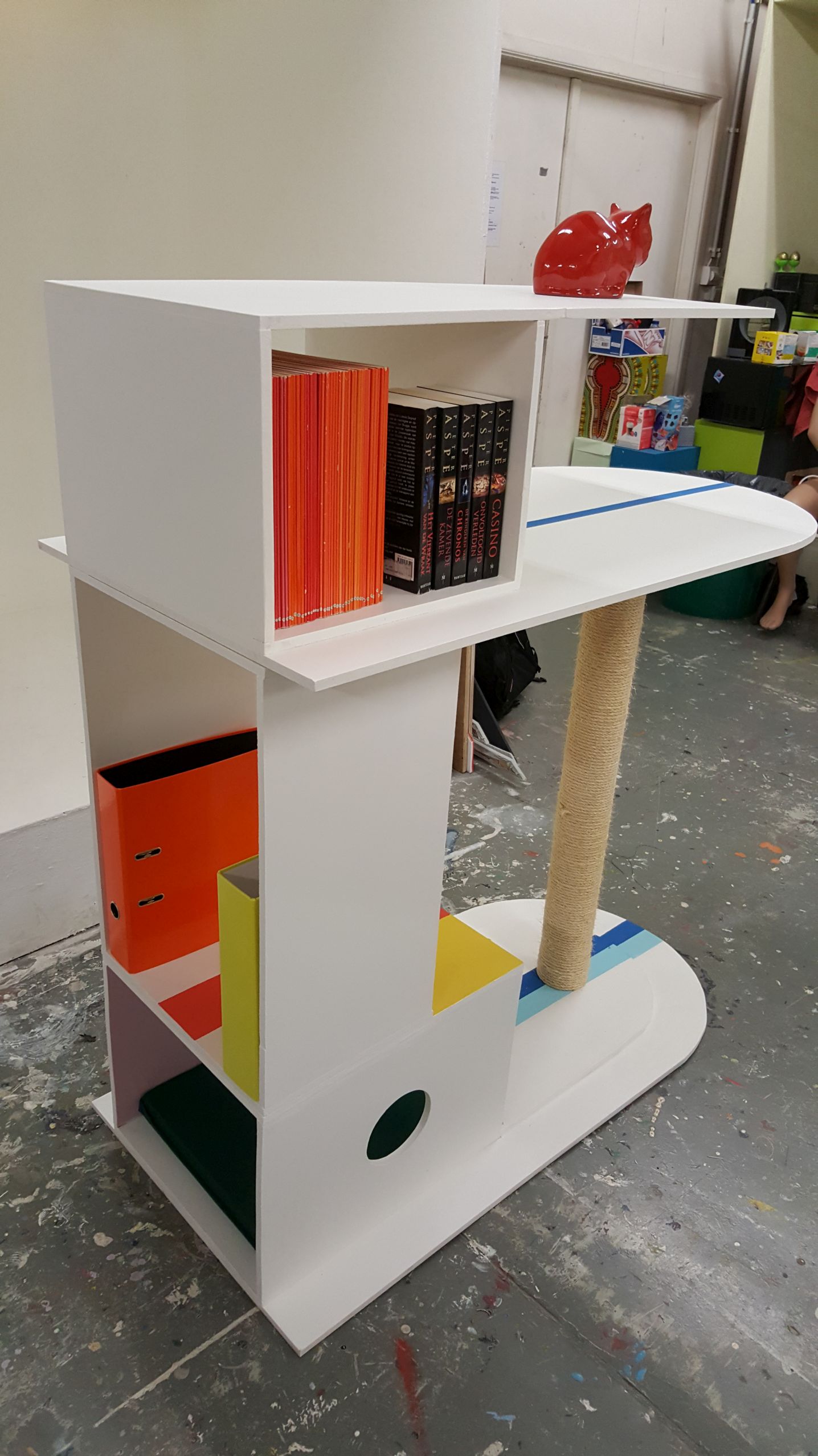 Dit kattenmeubel is gebaseerd op een tafel van designer John Smith. Hij maakt bij deze tafel gebruik van vele kleurvlakken en kenmerkende vormen die ik vertaald heb naar mijn eigen meubel. Bij het kattenmeubel komen de kleuren terug maar op een subtielere manier ook dankzij de boeken die gepresenteerd zijn. Het is dus een multifunctioneel meubel met een plaats voor de kat dat ook kan gebruikt worden als boekenkast.