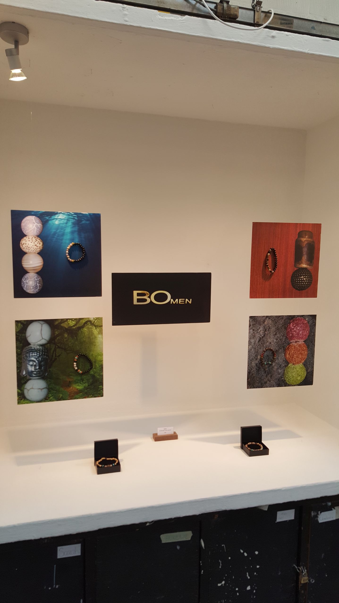 Deze etalage is ontworpen voor het merk BoMen, wiens juwelen gemaakt worden met natuurlijke materialen zoals parels, lavasteen en mahoniehout. In deze etalage heb ik door het gebruik van de vierkante prints deze materialen naar voor laten komen door telkens een combinatie te maken van sfeer- en materiaalfoto’s met uitvergrote delen van de juwelen.
